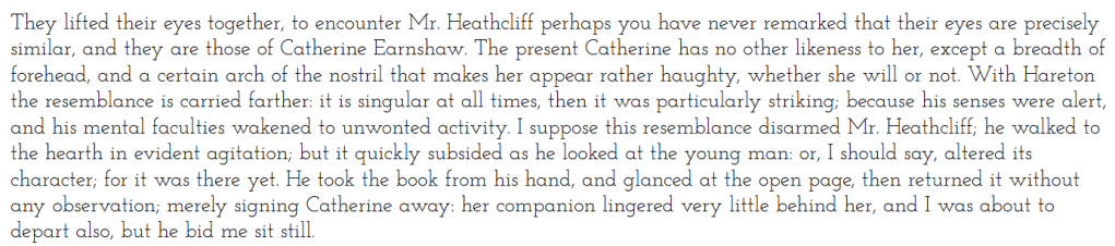 I realised, however, that while there wasn’t a haunting in the traditional sense, Heathcliff absolutely was haunted by Catherine. On her death, Catherine left behind her newborn daughter, Cathy, and the young girl is described as almost her double. Heathcliff and Catherine grew up together, so seeing young Cathy grow up, a vision of her mother, was almost a repetition of his own past with Catherine. Hareton too, though he was Hindley’s son, was said to look just like his aunt.